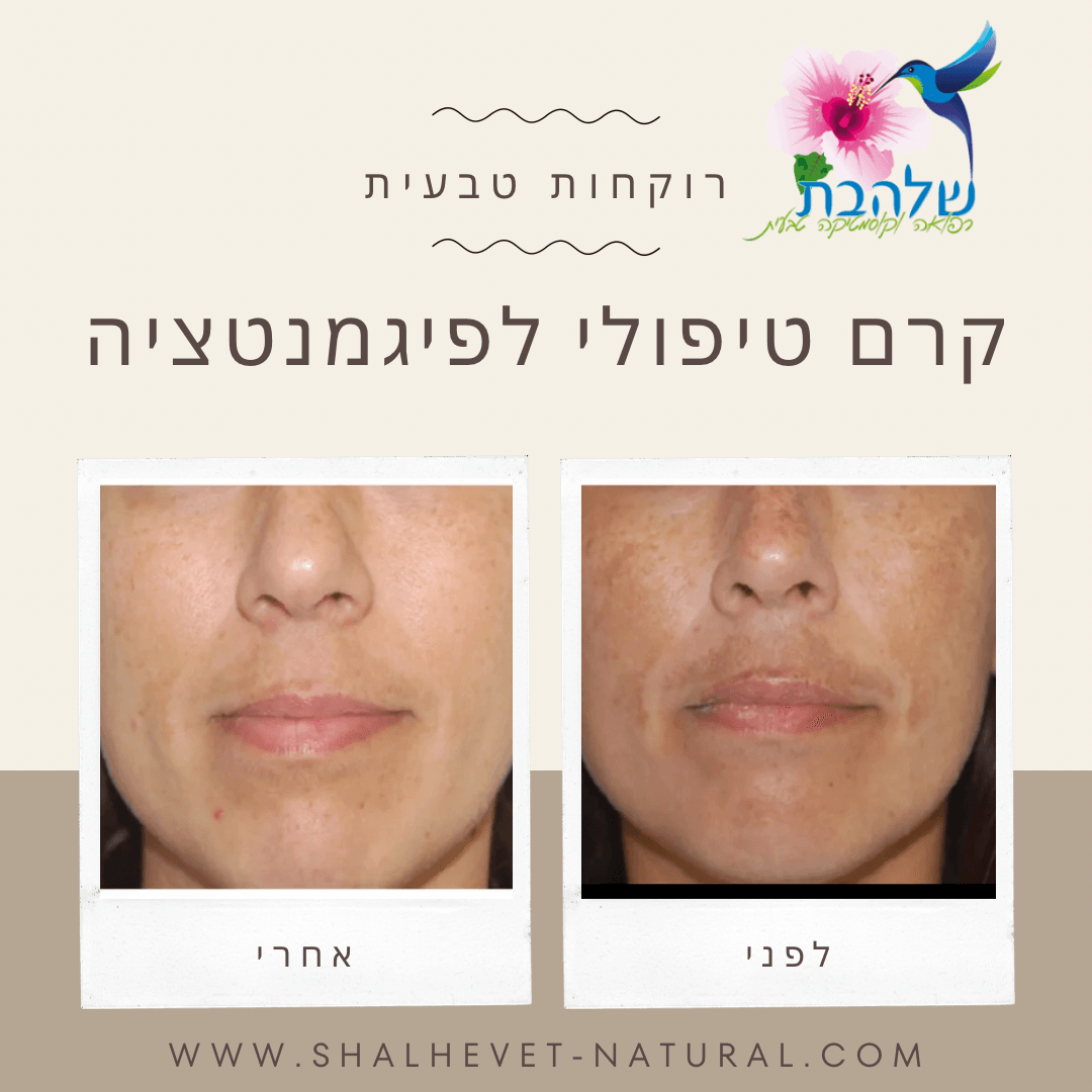 קרם הבהרה לטיפול בהיפרפיגמנטציה הנגרמת בעקבות שינויים הורמונליים כגון הריון ולידה מיוצר מ100% רכיבים טבעיים אורגניים מבהיר כהויות בעור מתאים לפנים ולכל חלקי הגוף למראה אחיד, בריא וזוהר